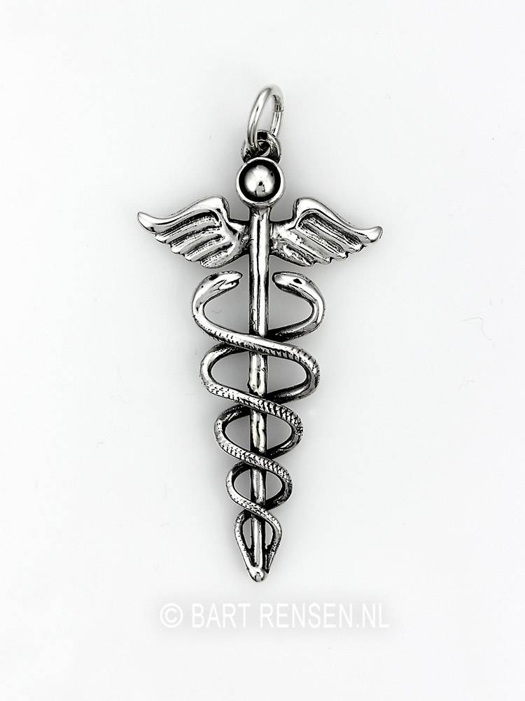 Verfijnd uitgevoerd in zilver. Ik draag dit soort symbolen het liefst met een zwart leren koord waardoor de Caduceus er nog beter uitspringt.