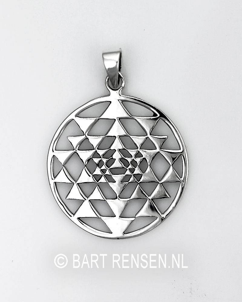 Vier van zijn driehoeken van de Sri Yantra hanger punten paar boven en vijf driehoeken naar onder.