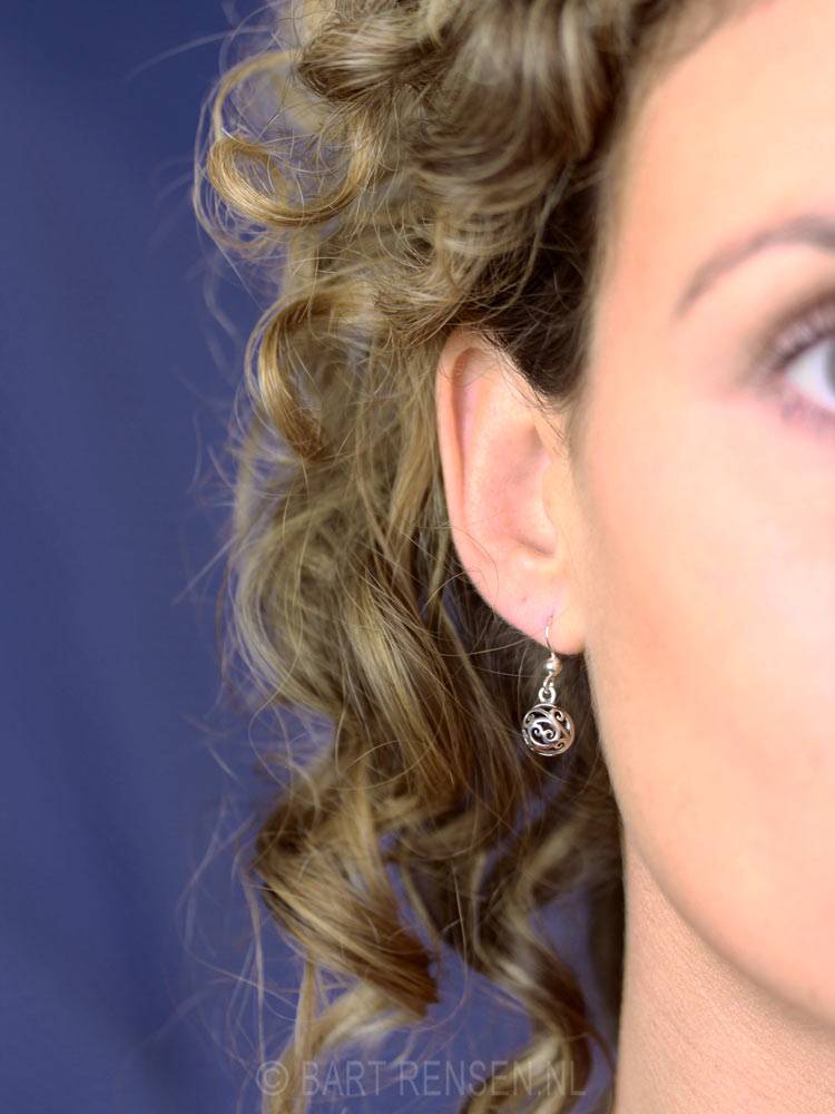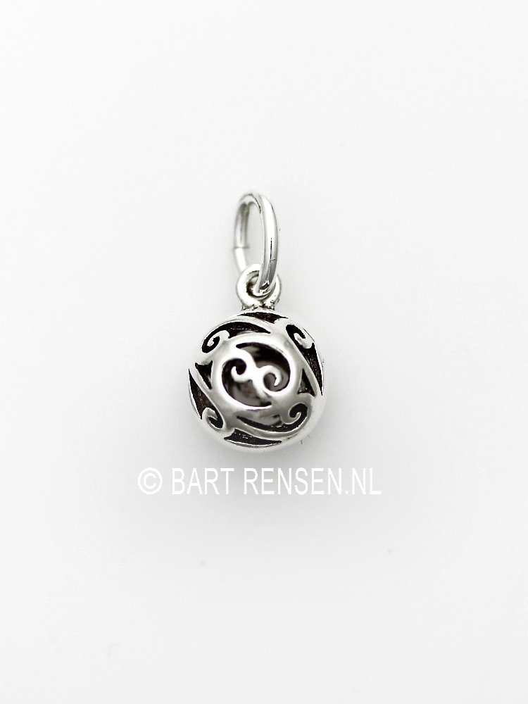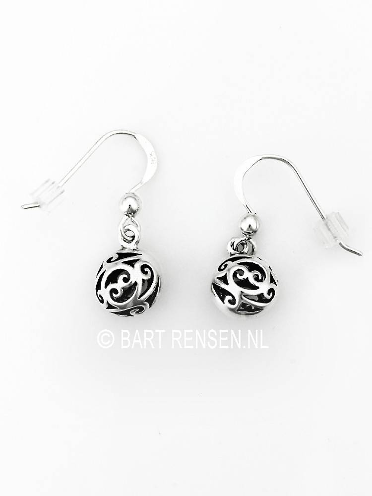 Zilveren bolletjes met een krullerig opengewerkt sierlijk motief.
