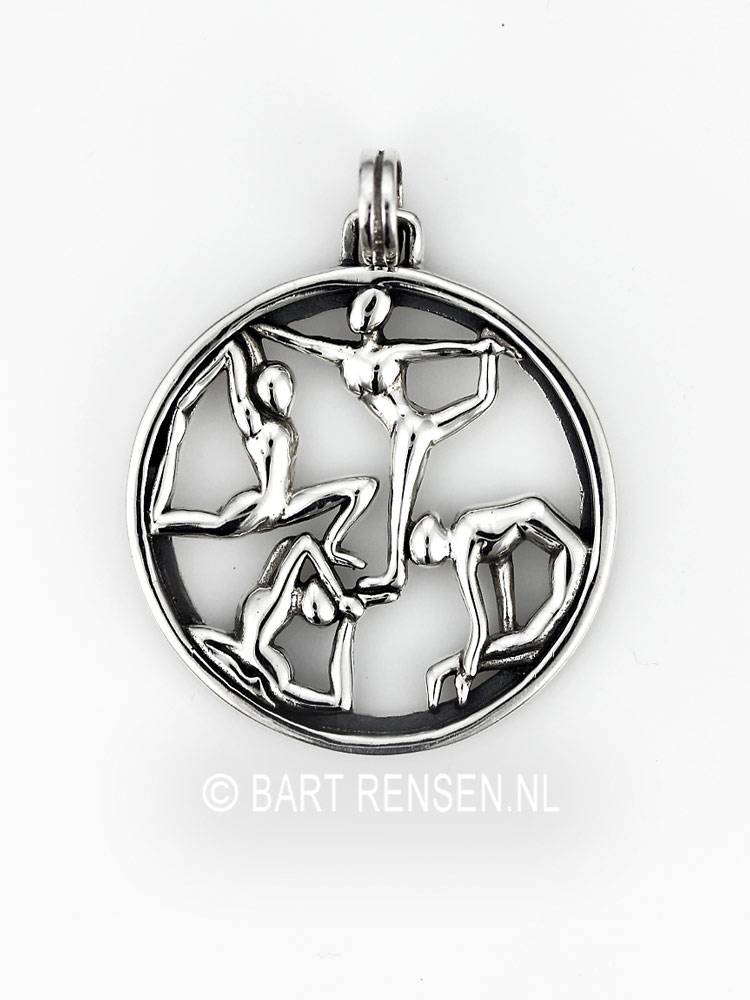 Het mooie vindt ik dat de hanger op afstand eruit ziet als een abstracte vorm, maar wanneer men goed kijkt zie je 4 figuurtjes die in een bepaalde yoga houding uitdrukken.